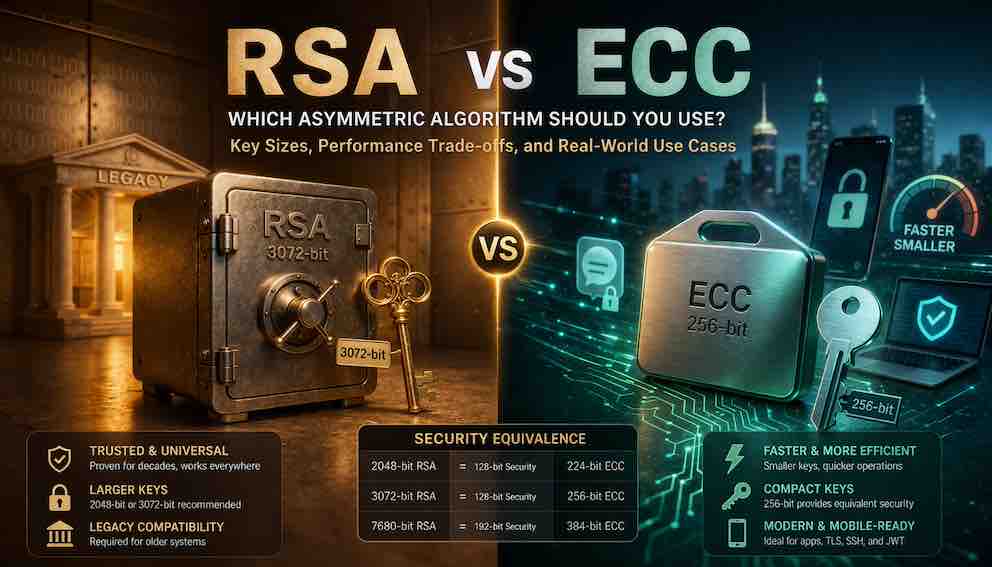 Choosing between RSA and ECC is one of the most important decisions in public-key cryptography, affecting everything from TLS handshake speed to JWT token size. RSA has been the gold standard since the 1970s, offering unmatched compatibility with legacy systems but requiring large 2,048-bit or 3,072-bit keys. ECC achieves the same security with much smaller 256-bit keys, making it faster, more efficient, and better suited for mobile devices, high-traffic servers, and modern applications. This article breaks down the security equivalence, performance trade-offs, and real-world scenarios to help you decide whether RSA, ECC, or both is right for your TLS certificates, SSH keys, and JWT signatures.