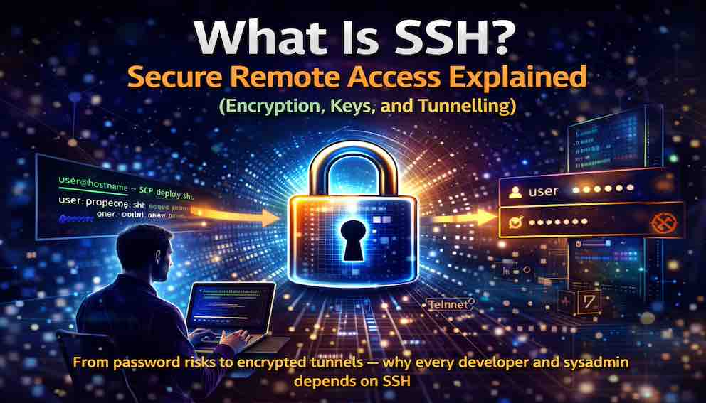 Every time a developer deploys code or a sysadmin reboots a remote server, SSH is probably the invisible tool making it safe. SSH (Secure Shell) creates an encrypted tunnel between your computer and a remote server, protecting everything you type from eavesdroppers on the network. Before SSH, protocols like Telnet sent passwords in plain text — dangerously exposed to anyone who cared to look. This article explains what SSH is, why it matters, how it works, and why it became the standard for secure remote access