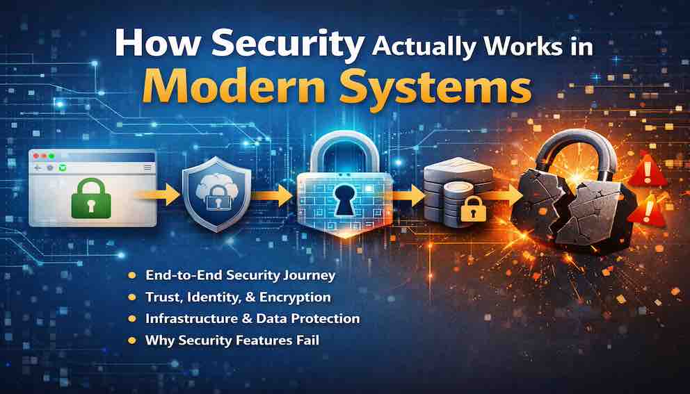Modern software security is not a single feature but a chain of trust spanning browsers, networks, backend systems, and databases. Each layer performs a specific role—establishing identity, enforcing access, protecting data, and maintaining resilience over time. When these layers work together, security is invisible; when even one fails, the entire system can be compromised. This article builds a mental model of how secure systems actually work—and why they fail in practice